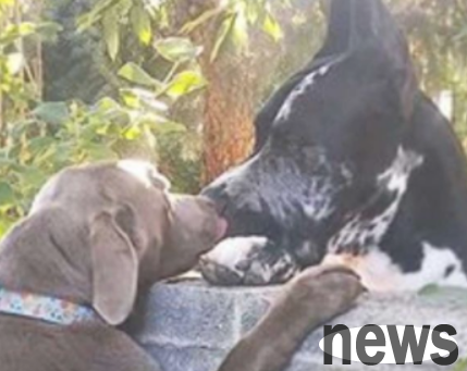 Although they only live in the neighborhood, separated by only a wall, the Great Dane can already see his neighbor when he stands up. The Labrador retriever is small and can't see each other when standing up, which makes the Labrador retriever feel disappointed. However, the owner of the Labrador retriever has thought of a thoughtful way to let the dogs see each other casually to soothe the pain of missing each other. That is to help the Labrador retriever place a small stool under the wall to achieve the dog's wish of meeting