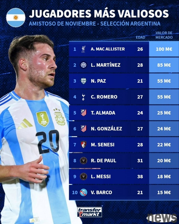 The German transfer market has compiled statistics on the player value of this current Argentina team list. McAllister ranks first with 100 million euros, and Messi ranks 9th with 18 million euros.