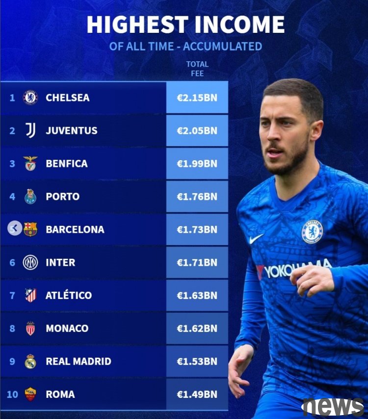 "Transfer Market" counts the total historical transfer fee income of each team, and Chelsea beat Juventus to top.