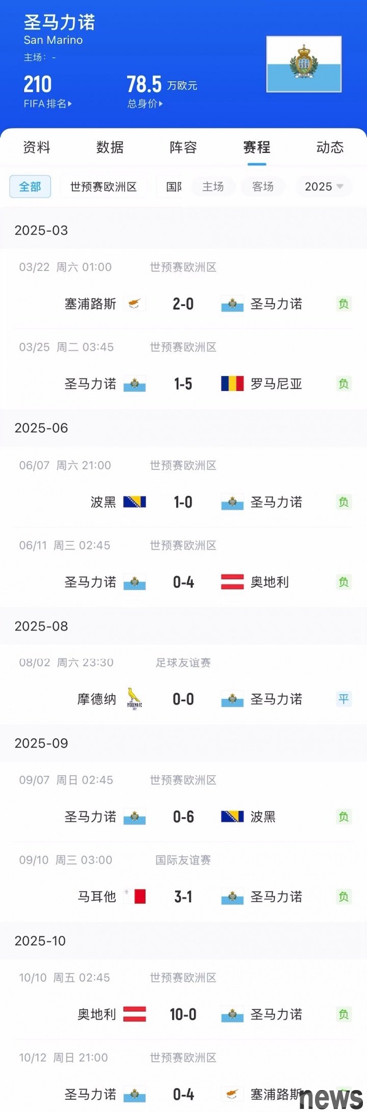 Since 2025, San Marino has played in a total of 9 international matches and achieved a record of 1 draw and 8 losses, with a dismal goal-to-goal ratio of 2-35.
