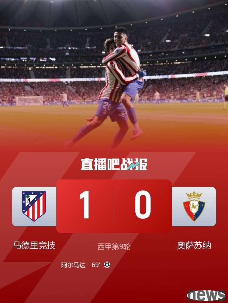 La Liga - Atletico Madrid 1-0 Osasuna temporarily promoted to fourth place. Almada scored the first goal to win and Simeone assisted.