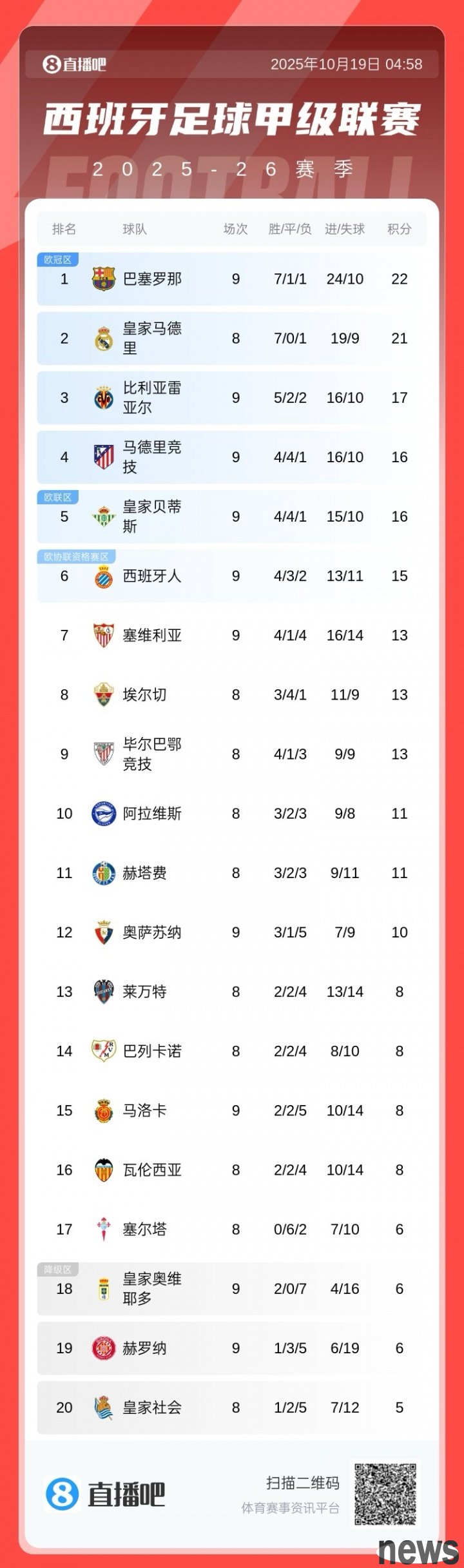 finally squeezed into the top 4! La Liga standings: Atletico Madrid is undefeated in 8 rounds and promoted to fourth place. Barcelona has a 1-point advantage and temporarily reaches the top.
