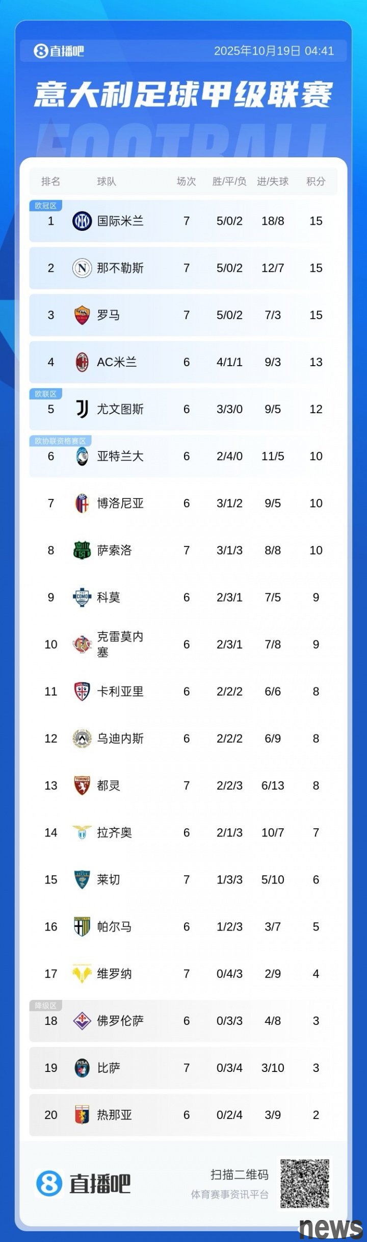 3 teams have the same points! Serie A standings: Inter Milan, Napoli, and Roma have the top three records with 5 wins and 2 losses