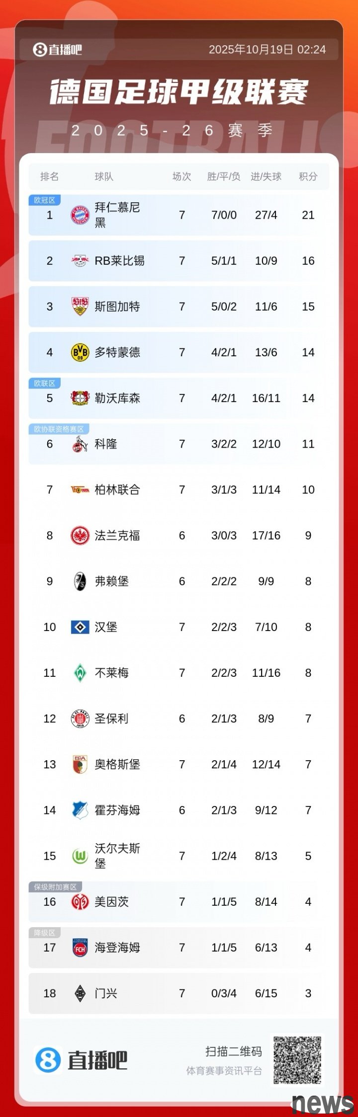 Absolute dominance! Bundesliga standings: Bayern leads with 5 points with 7 wins in all games, Dortmund lost its first defeat of the season