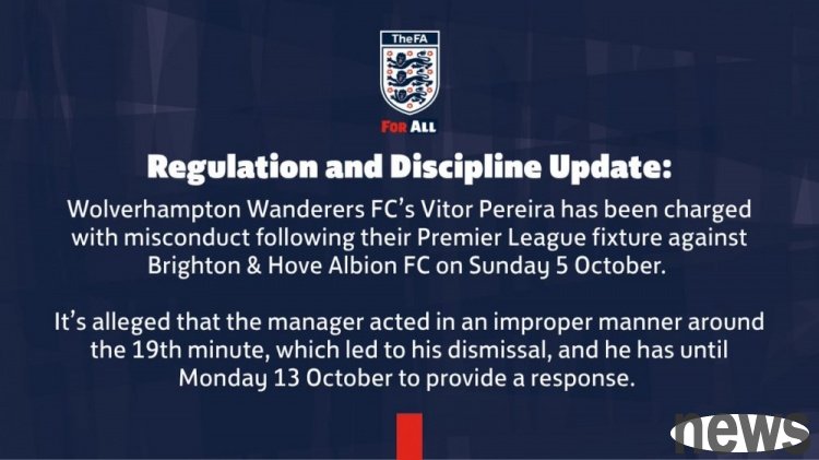 A few days ago, the Football Association of England officially issued an announcement: "Wolves coach Pereira was accused of inappropriate behavior after the Premier League match against Brighton on Sunday, October 5. It is alleged that Pereira behaved inappropriately around the 19th minute, which resulted in him being sent off. He needs to respond before Monday, October 13."