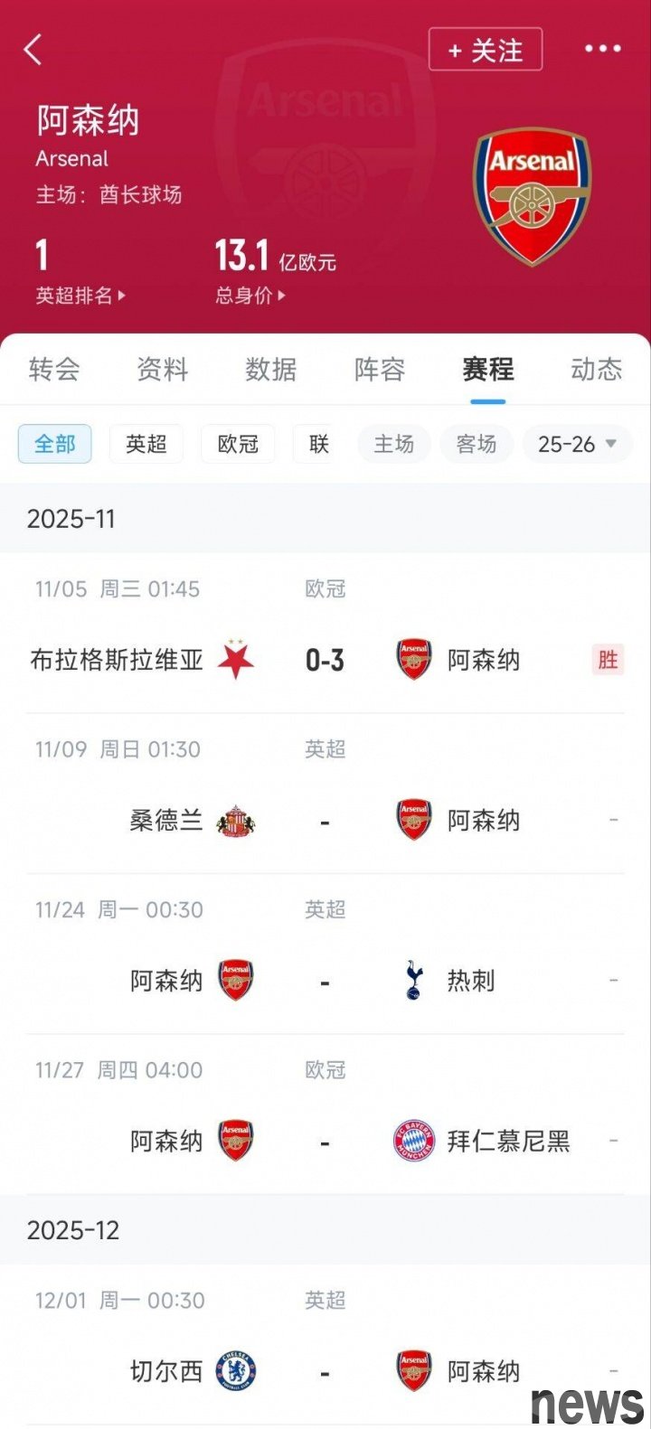 Next, the "devil" Arsenal will face a "devil" schedule: Sunderland, 4th in the Premier League, Tottenham, 6th in the Premier League, Chelsea, 7th in the Premier League, and Bayern, the "devil" in the Champions League. The Bundesliga hegemon has won 16 consecutive games since the start of the season.