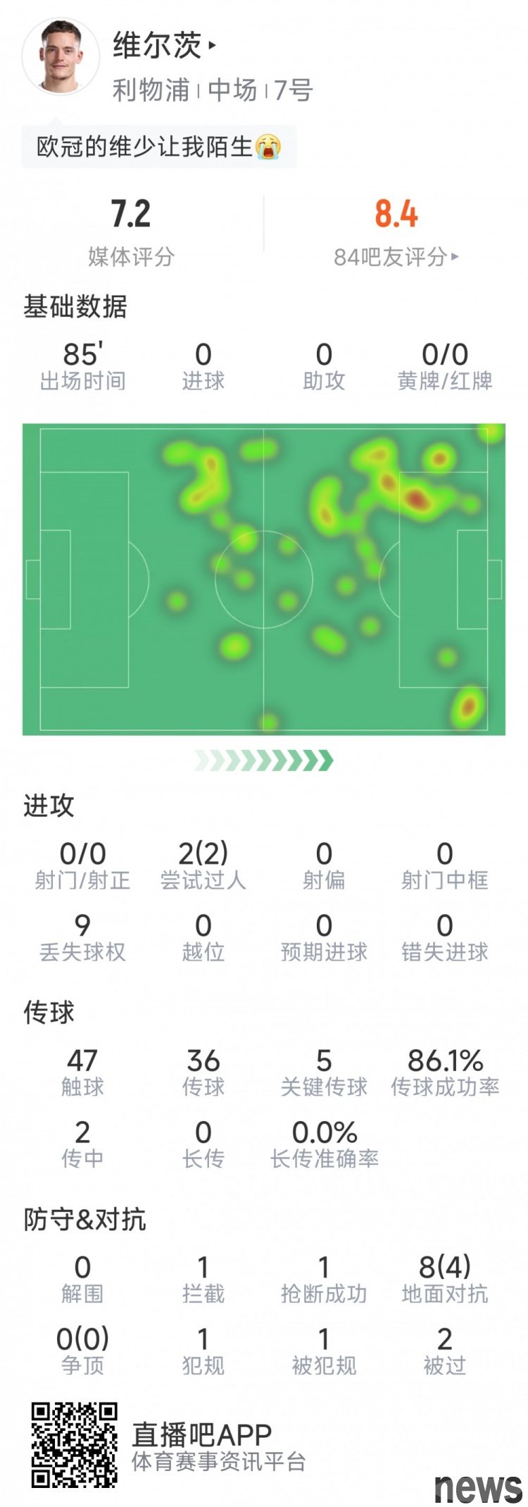 In this round of the Champions League match between Liverpool and Real Madrid, Wirtz performed well. The following are his statistics in this game: