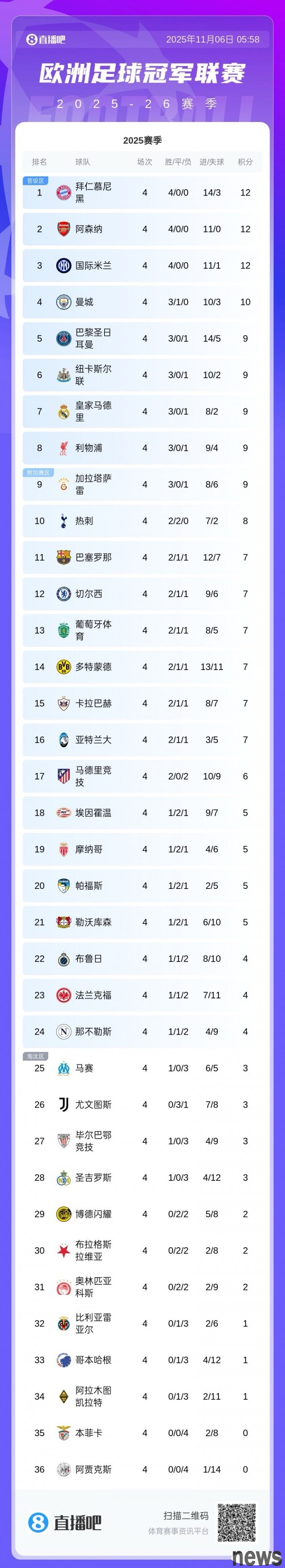 All matches in the fourth round of the Champions League are over, and the latest standings are released. Currently in the standings, Bayern Gunners Inter Milan leads the way with a victory! Benfica and Ajax finished bottom of the table with a complete defeat.